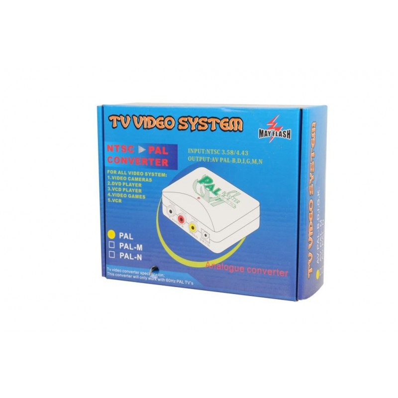 The NTSC to PAL Converter converts any NTSC (3.58/4,43) signal into a PAL signal (any PAL B,D,I,G,M,N). Utilizing traditional composite RCA connections, the NTSC to PAL Converter is optimized for video game consoles, DVD players, video recorders (must support 60Hz) or any other AV equipments.
