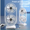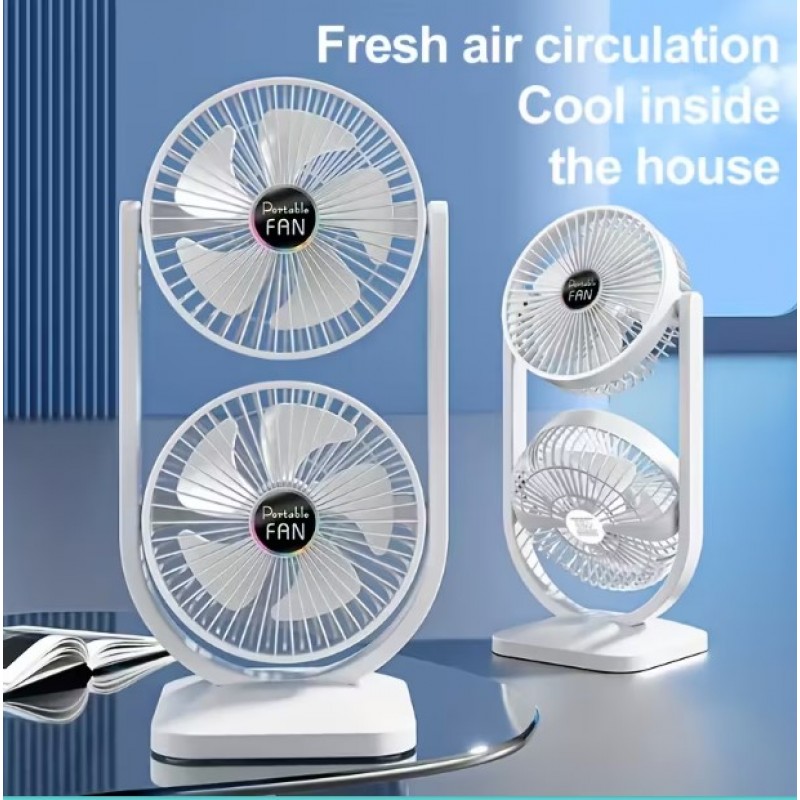 Ventilatore da scrivania a doppia testa, ventola a turbina duale, ventilazione ad aria circolante, design a due pale, flusso d'aria doppio, tre velocità regolabili, angolo regolabile su e giù, uso bidirezionale, batteria al litio ad alta capacità, funzionamento prolungato, silenzioso, rete di sicurezza ad alta densità, adatto per casa, ufficio, sport all'aperto e altri scenari