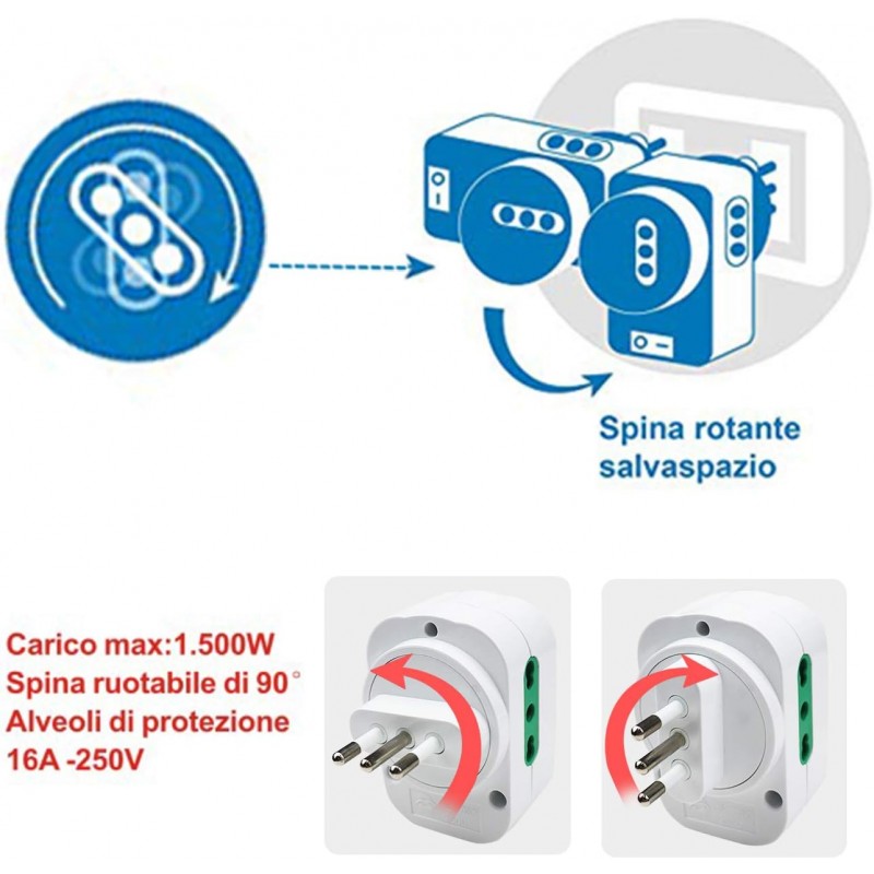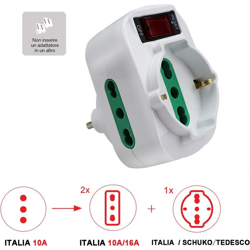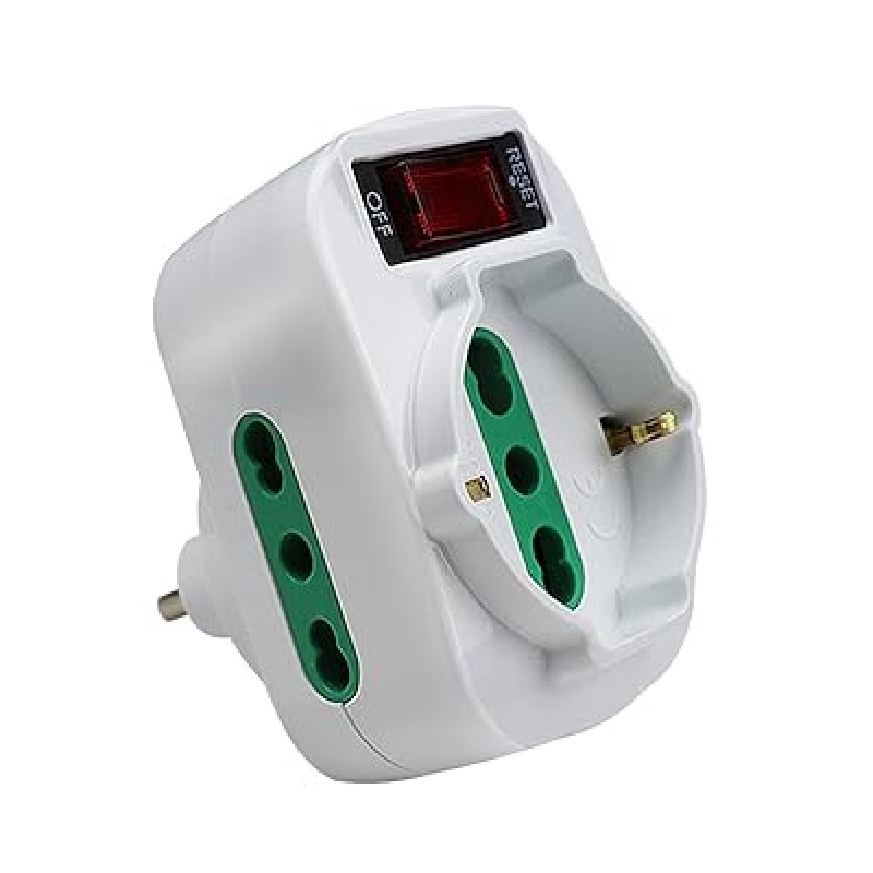 - Adattatore Multipresa Tripla ,con protezione sovraccarico ed interruttore,Adattatori da Schuko a Spina Piccola 10A,Spina Rotante,Bianco