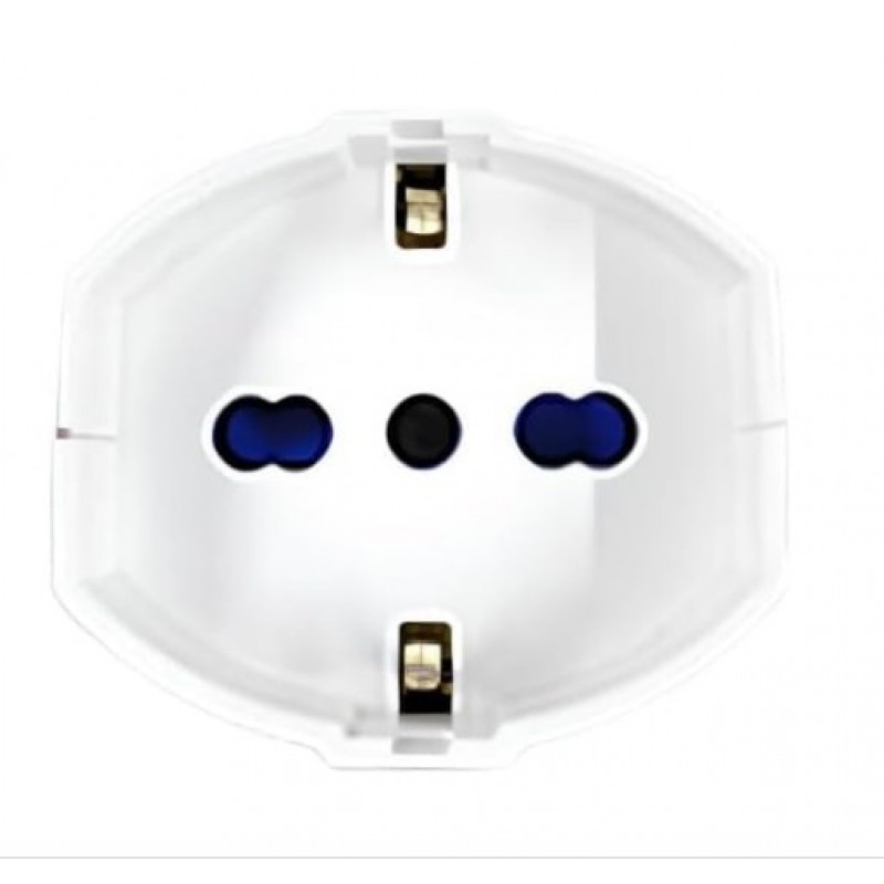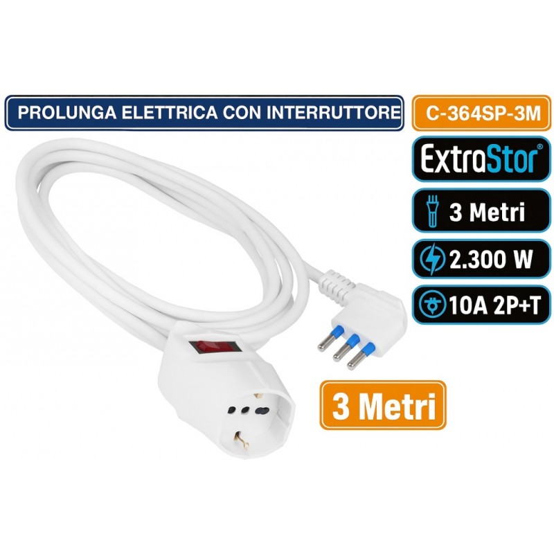 Presa pluri-standard 3 metri 10/16A 2P+T, standard italiano 10/16A e tedesco 16A con terra laterale, spina salvaspazio 10A 2P+T, cavo H05VV-F. Interruttore di sicurezza che interviene in modo automatico togliendo l'alimentazione in caso di sovraccarico superiore ai 2300W.