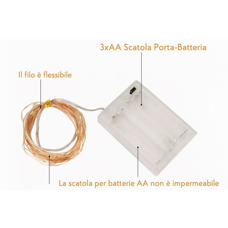 - Questa catena luminosa a filo è composta da 100 LED con un angolo del fascio di 360 gradi. Sono necessarie 3 batterie AA (non incluse). Il filo d'argento isolato mantiene le lampade a basse temperature in modo che possano essere toccate dopo molte ore di funzionamento senza il rischio di ustioni. Le lucine a LED non danneggerebbero bambini e animali domestici.
