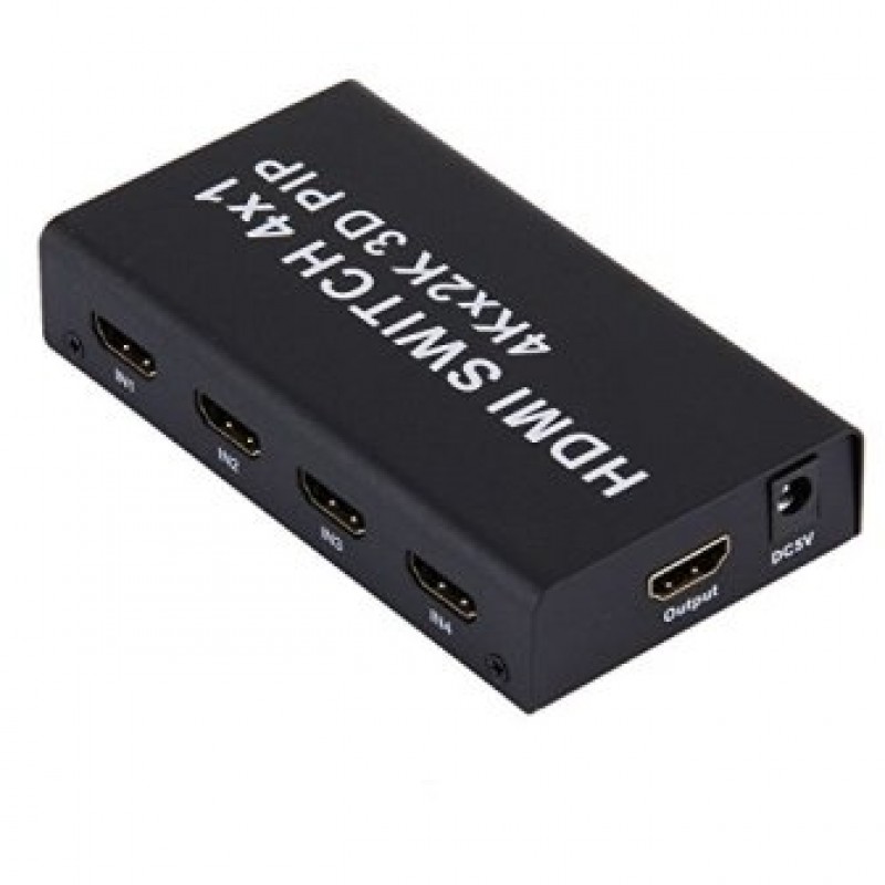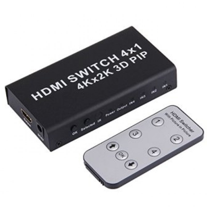 Questo 4x1 HDMI Switch consente di collegare 4 sorgenti HDMI per essere commutate ad un unico terminale HDMI tramite telecomando o pulsanti manuali. Supporta tutti i formati HD, inclusi 720p 1080i 1080p 4Kx2K ideale per sistemi home theater.  Questo interruttore ha la funzione di Picture-in-Picture, il che significa che un programma (canale) viene visualizzato sullo schermo del televisore completo allo stesso tempo come uno o più altri programmi vengono visualizzati sul incasso piccole finestre. Il suono è da solo il programma principale. Supporta fino a 3 sotto-schermi in una sola volta, in modo da poter vedere 3 altre sorgenti di ingresso mentre si guarda la schermata principale.