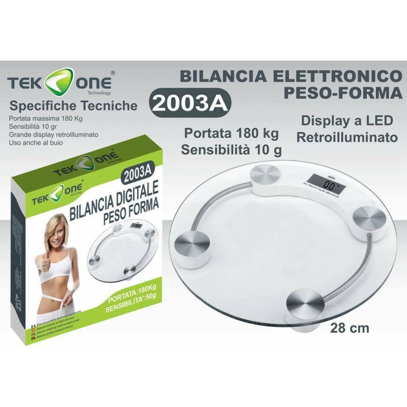 Bilancia elettronica digitale costruita e concepita per pesare fino a 180 Kg. Composta da una base in vetro,rende possibile che la bilancia possa essere collocata in tutti gli ambienti domestici con qualsiasi tipologia d'arredamento.Il funzionamento è dato dalle batterie CR 2032, oltretutto, la bilancia dopo trascorso un periodo d'inattività, si spegne automaticamente per evitare un consumo superfluo delle batterie. Caratteristiche tecniche:Bilancia pesa-persone digitale con display lcd termometro temperatura ambientale integrato,Si accende con il peso del piede,Resettaggio automatico,Spegnimento automaticoIndicatore di sovraccaricoIndicatore di batterie scaricheCapacità di pesatura: 180 Kg. - con divisione 100 gr.Doppia unità di misura (Kg e libbre)Struttura in vetro La confezione contiene:Nr. 1 Bilancia digitale
