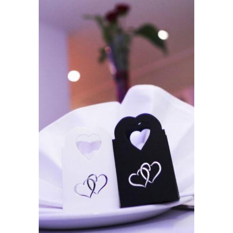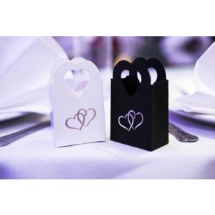 La scatolata a forma di shopper con il manico, decorata con due cuori intracciati come segno dell'amore inseparabile, un buon augurio per la festa.