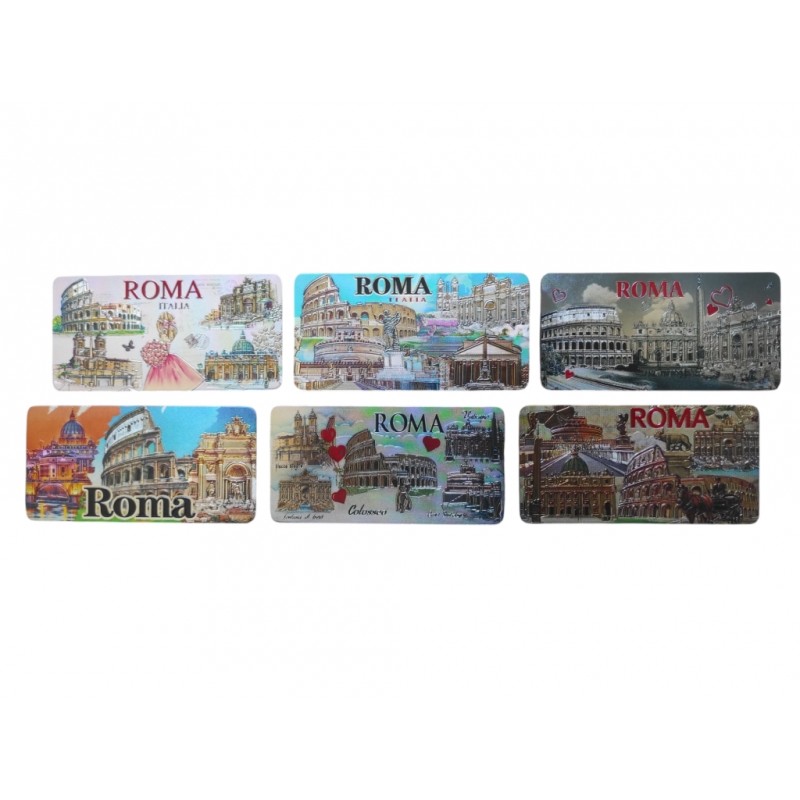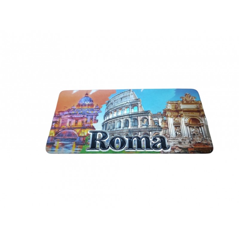 Ogni calamita presenta una stampa dettagliata e colorata di monumenti celebri, tra cui il Colosseo, la Basilica di San Pietro, il Pantheon, Piazza del Popolo, Piazza Venezia, Fontana di Trevi e altre meraviglie della Città Eterna. L'uso di colori vivaci e scritte ben evidenziate come "ROMA" e "ITALIA" aggiunge un tocco artistico e distintivo a ogni pezzo.