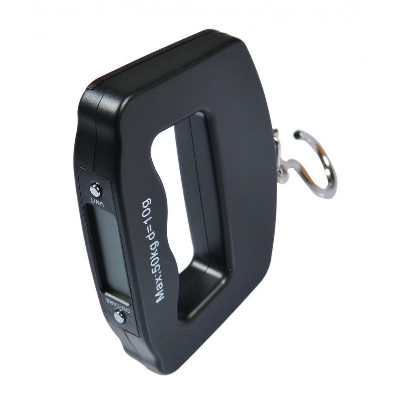 Bilancia elettronica per bagli (max. 40 kg). Facile lettura del peso (g / lb / oz / kg) grazie al display LCD a 5 cifre (48 x 12 mm) con retroilluminazione blu. Indicazione di batteria scarica e sovraccarico. Funzione di spegnimento automatico, blocco dei dati e della tara. Alimentazione: 2 batterie tipo AAA (incluse).