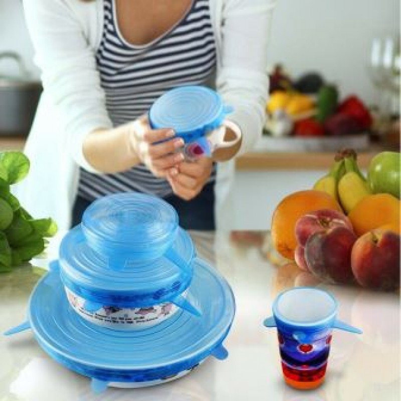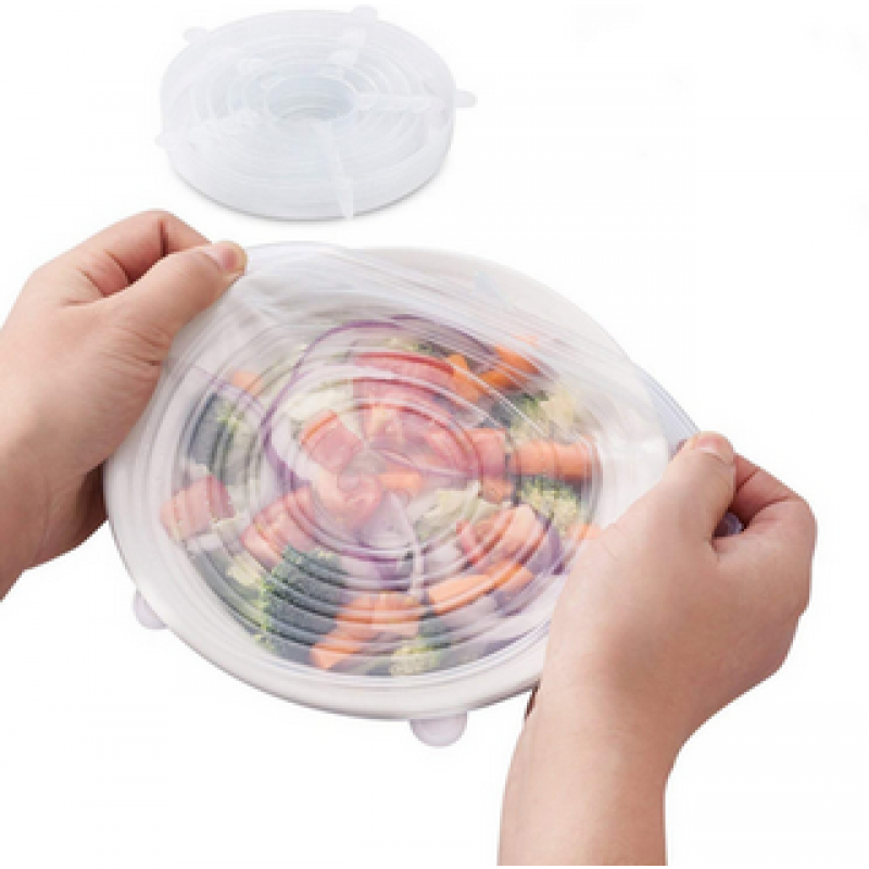 Kit 6 coperchi salva freschezza in silicone alimentare atossico, di varie dimensioni e allungabili.