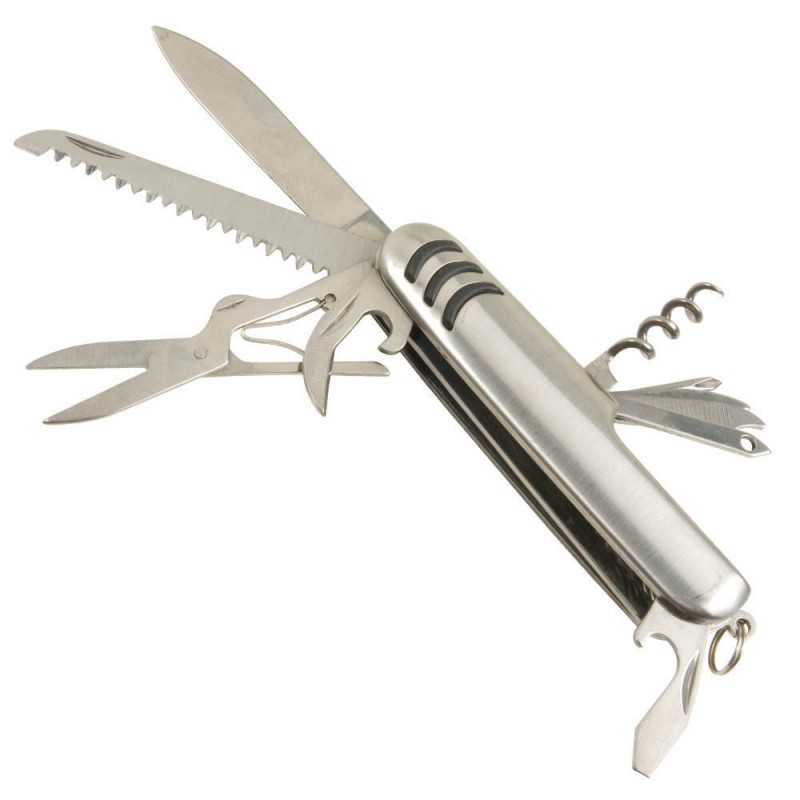 Coltellino Multiuso 11 funzioni LAMA PICCOLA-SEGHETTO-LAMA DRITTA-APRISCATOLE-APRIBOTTIGLIE-CACCIAVITI-FORBICI-AGGANCIO PORTACHIAVI- CAVATAPPI.